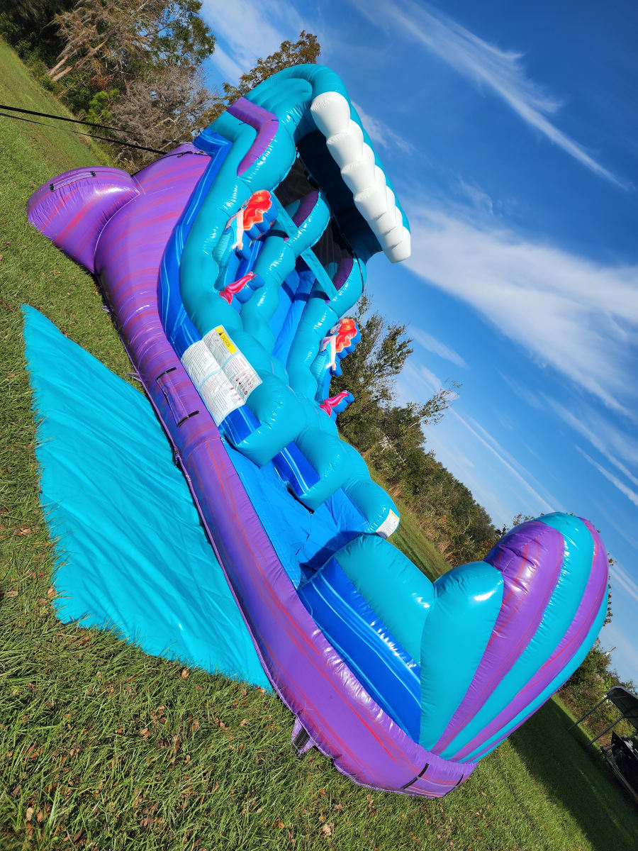 Bring the magic of the ocean to your backyard with the Mermaid Splash Water Slide — a colorful, eye-catching inflatable that turns any party into an underwater adventure! Standing 15 feet tall, this single-lane water slide is perfect for kids of all ages who want to beat the Florida heat with some mermaid-style thrills.