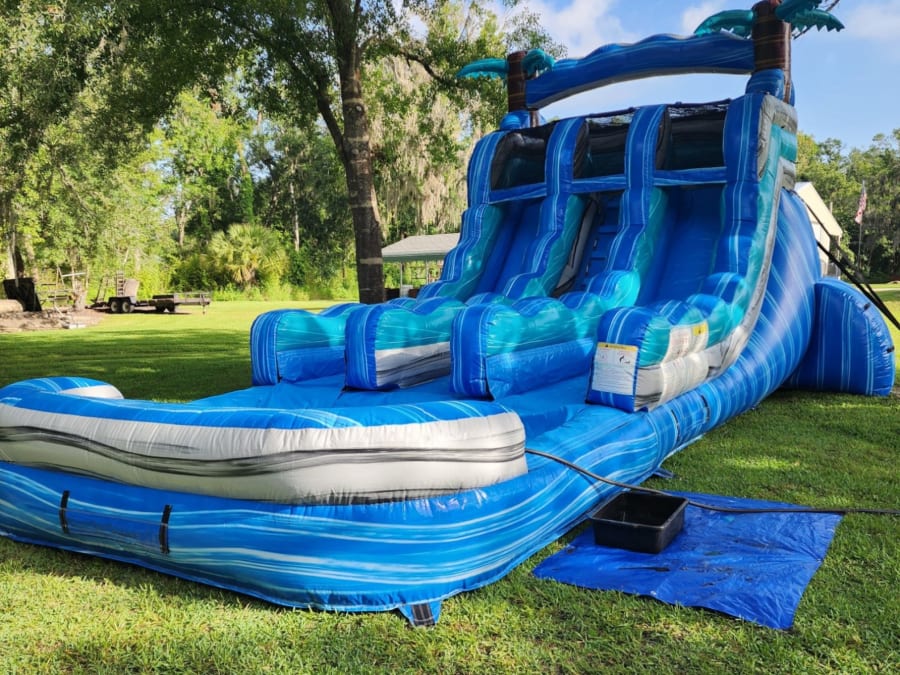 With palm trees, ocean wave patterns, and vibrant blue and gray tones, the Cayman Crush looks like it was plucked right off a Caribbean island. Whether you're hosting a backyard luau or just want to beat the Florida heat, this water slide brings cool, competitive fun that’s perfect for kids, teens, and even adventurous adults!