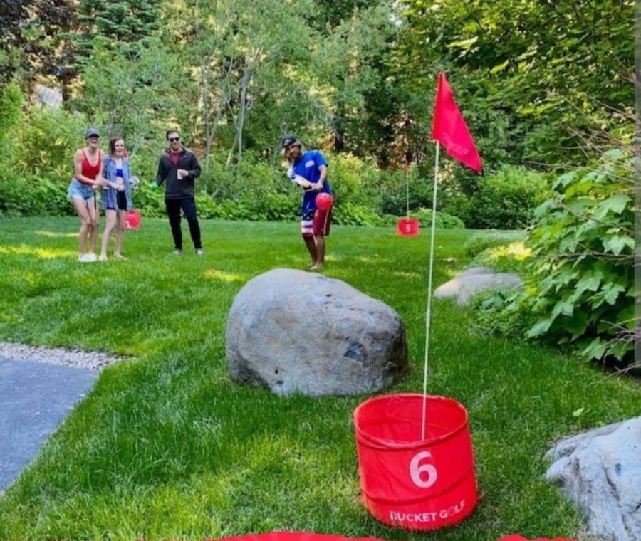 Bucket Golf is a portable 9-hole mini golf-style game where players aim to chip or toss the ball into bucket “holes” placed around your yard or event space.