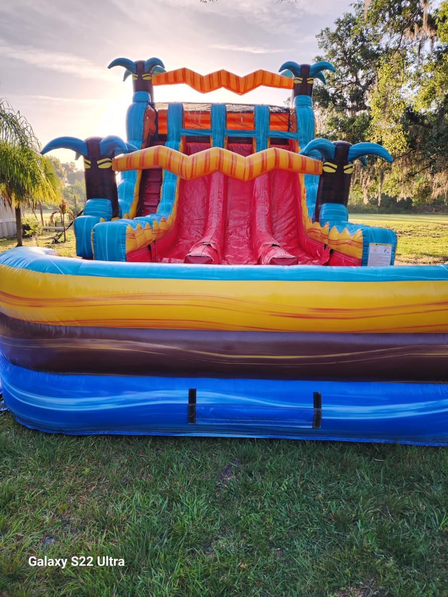 With palm trees, lava-inspired accents, and Triple racing lanes, Tropic Shock is designed to impress guests of all ages. Whether you're throwing a birthday bash or planning a large community event, this slide brings maximum fun, bold colors, and a splash zone big enough to cool everyone off.