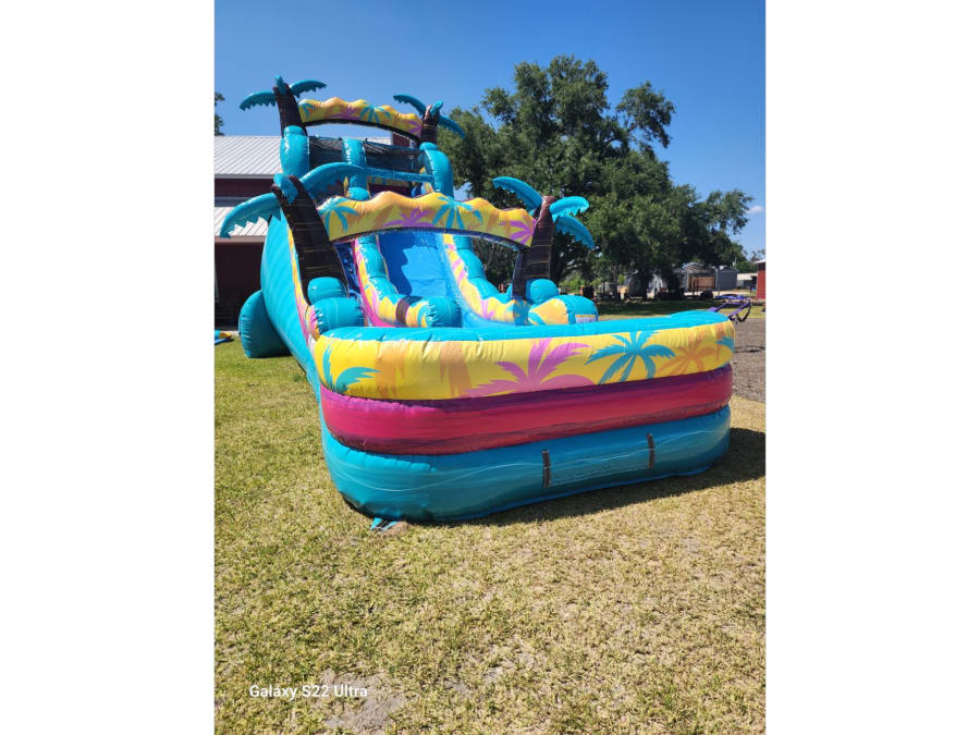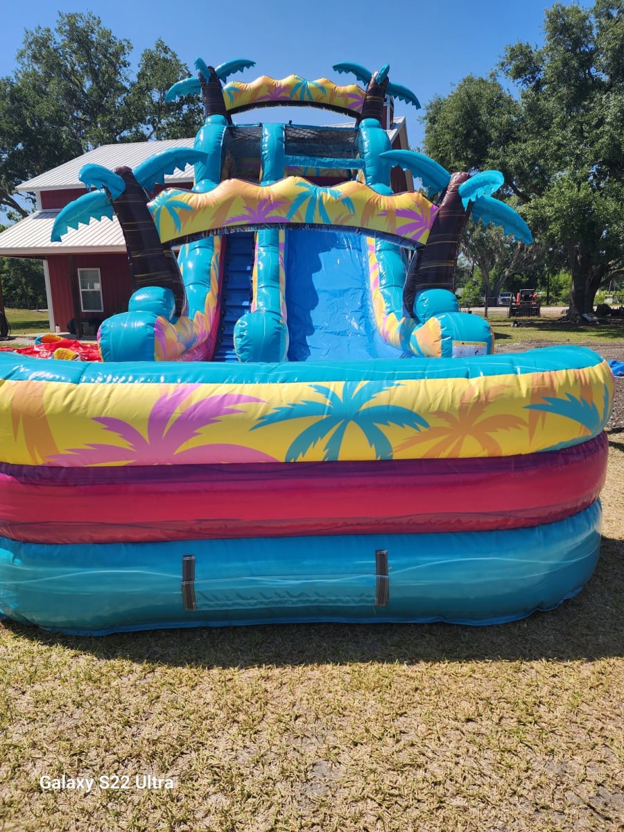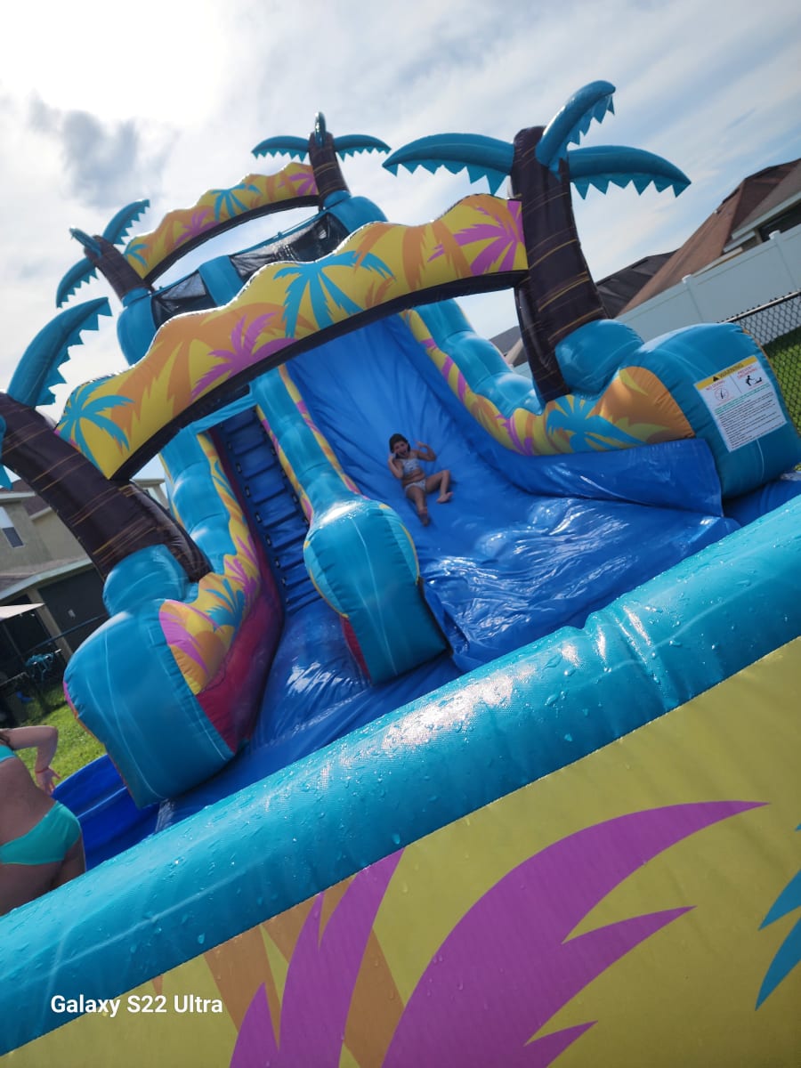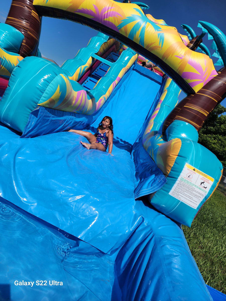 With bright, bold colors and palm tree accents, the Island Flow brings that tropical vacation energy to every event. Its long slide lane and oversized splash pool make it a favorite for kids, teens, and anyone looking to cool off in style.