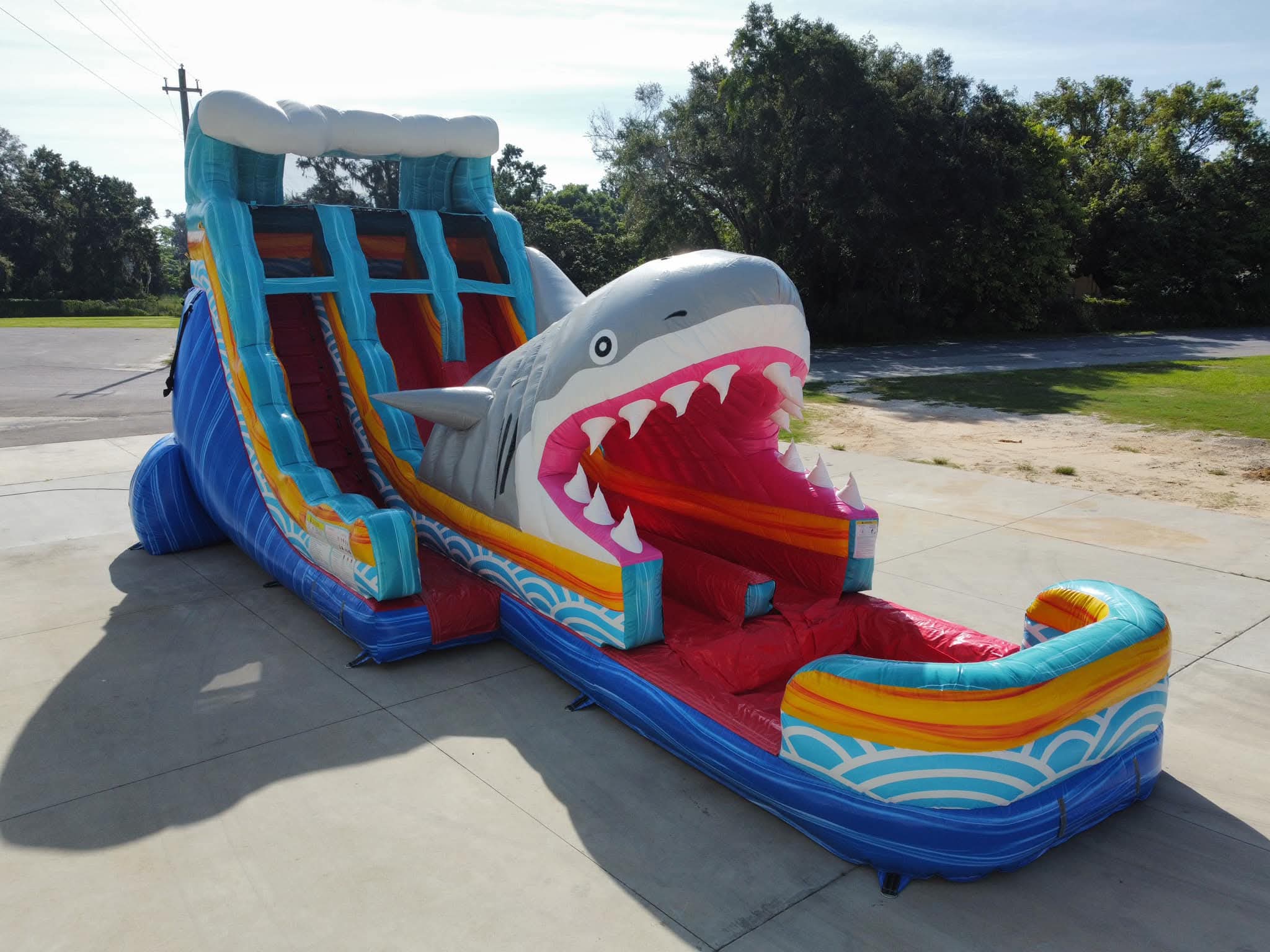 Looking for the ultimate way to beat the Florida heat and bring thrilling fun to your next party or event? Meet the Great White Splash Dual Lane Water Slide—a jaw-dropping inflatable adventure that will take your celebration to the next level. Standing 19 feet tall, 19 feet wide, and 38 feet long, this massive inflatable water slide is more than just a rental—it’s an unforgettable experience that your guests will talk about long after the party ends.